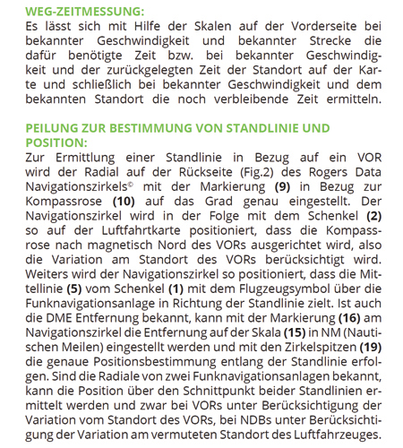 Pour déterminer une ligne de référence correspondant au relèvement d’un VOR: au dos du compas de navigation Rogers Data, afficher la valeur du relèvement au degré près sur le rapporteur grâce a l’index. Le compas de navigation est ensuite positionné sur la carte aéronautique avec le bras de telle sorte que le rapporteur soit orienté vers le Nord magnétique du VOR. La variation doit être prise en compte à l’emplacement du VOR. Le compas de navigation est ensuite positionné de manière à ce que la ligne médiane du bras portant le symbole de l’avion soit dirigée vers la ligne de relèvement via la balise de radionavigation. Si la distance DME est également connue, l’index sur le compas de navigation permet d’afficher la distance sur l’échelle en milles nautiques (NM) et de déterminer la position exacte le long de la ligne de relèvement avec les pointes du compas. Si les radiales de deux balises de radionavigation sont connues, la position peut être déterminée par l’intersection des deux lignes de relèvements, en tenant compte, pour les VOR, de la variation par rapport à l’emplacement du VOR et, pour les NDB, de la variation à l’emplacement supposé de l’aéronef.